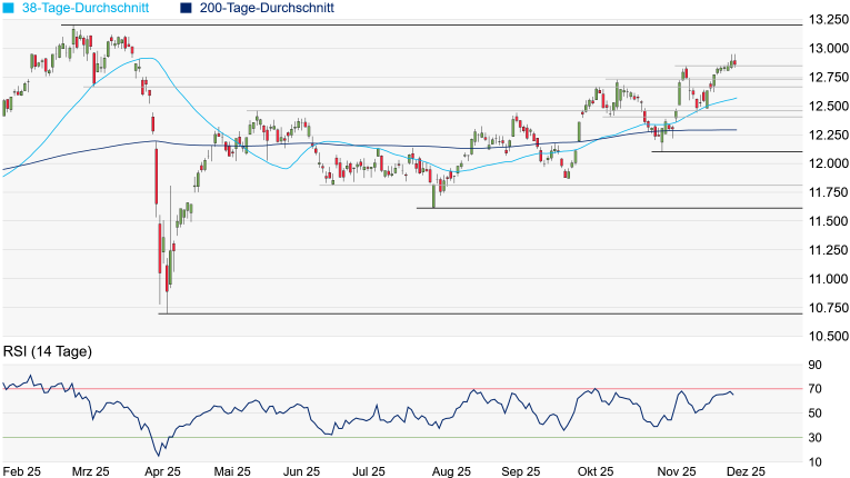 Für den SMI ist gestern eine Serie von zuletzt zehn Zuwächsen in Folge gerissen. Doch aus charttechnischer Sicht ist kaum etwas geschehen. Der SMI konnte sich oberhalb des Zwischenhochs vom 13. November bei 12.843 Punkten behaupten, womit der Weg in Richtung Rekordhoch vom 3. März bei 13.199 Punkten weiterhin nahezu unverbaut ist. Lediglich das Zwischenhoch vom 18. März bei 13.117 Punkten könnte einen Angriff auf das Rekordhoch noch erschweren. Doch selbst, wenn das Zwischenhoch vom 13.November wieder unterschritten wird, würde noch keine akute Gefahr drohen. Erst das Unterschreiten des Mai-Hochs bei 12.461 Punkten würde das kurzfristige Chartbild wieder etwas gravierender eintrüben. Zuvor würden sich mit dem Oktober-Hoch bei 12.726 Punkten, dem Zwischentief vom 11. März bei 12.668 Punkten und der aktuell bei 12.570 Punkten verlaufenden 38-Tage-Linie noch einige solide Unterstützungen in den Weg stellen.
