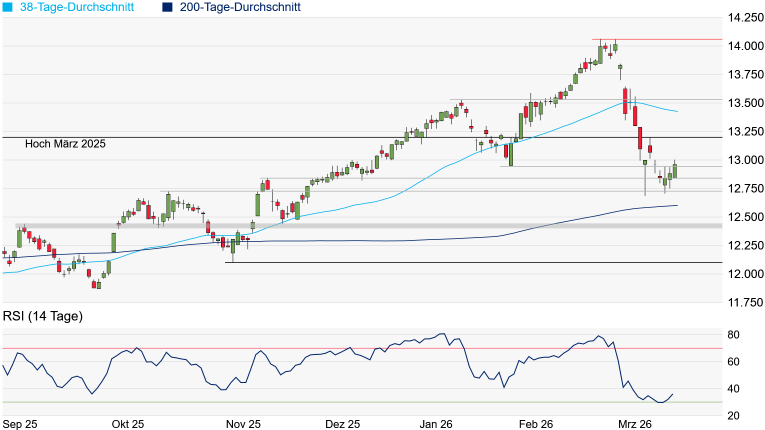 Charttechnik: Der SMI hat gestern einen kräftigen Satz nach oben gemacht und ist erstmals seit dem 25. März wieder oberhalb der 13.000-Punkte-Marke aus einem Handel gegangen. Das Chartbild hat sich jedoch kaum verändert – das nächste signifikante Hindernis taucht weiterhin erst am Zwischenhoch vom 18. März bei 13.117 Punkten auf. Doch der Fokus liegt längst auf dem Rekordhoch vom 3. März bei 13.199 Punkten. Kann der SMI das Hoch überqueren, wäre erst einmal reichlich Luft nach oben. Auf derUnterseite droht zunächst wenig Gefahr. Erste Unterstützungen warten am November-Hoch bei 12.843 Punkten und am Tief der Vorwoche bei 12.821 Punkten. Weitere Unterstützungen würden am Oktober-Hoch bei 12.726 Punkten und am Zwischentief vom 11. März bei 12.668 Punkten auftauchen, ehe bei 12.644 Punkten bereits die 38-Tage-Linie auftaucht. Erst darunter würde sich das kurzfristige Chartbild leicht eintrüben.