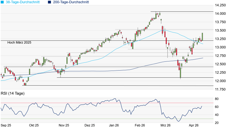 Der SMI machte am Freitag einen kräftigen Satz nach oben und übersprang erneut das Hoch vom März 2025 bei 13.199 Punkten, womit sich die Chart-Situation wieder deutlich aufgehellt hat. Im Anschluss setzte der SMI bei 13.427 Punkten ein neues Erholungshoch. Auf der Oberseite wäre zunächst noch Platz bis zum Januar-Hoch bei 13.529 Punkten, ehe das Rekordhoch vom Februar bei 14.064 Punkten wieder in den Fokus rücken könnte. Doch die Vorgaben für den Start in die neue Handelswoche sind ersteinmal wieder deutlich negativ. Der Markt beginnt, eine zeitnahe Lösung im Konflikt wieder auszupreisen – ablesbar am Ölmarkt, wo die Ölpreise in der Früh jeweils um gut 5 Prozent im Plus notieren. Der Start in die neue Handelswoche dürfte somit holprig verlaufen – der Broker IG taxt den SMI in der Früh gut 75 Punkte tiefer. Auf der Unterseite könnte die nun als Unterstützung fungierende Marke von 13.199 Punkten durchaus wieder in den Fokus rücken. Weitere wichtige Supportbereichewürden im Anschluss an der aktuell bei 13.099 Punkten verlaufenden 38-Tage-Linie und am Januar-Tief bei 12.942 Punkten warten.