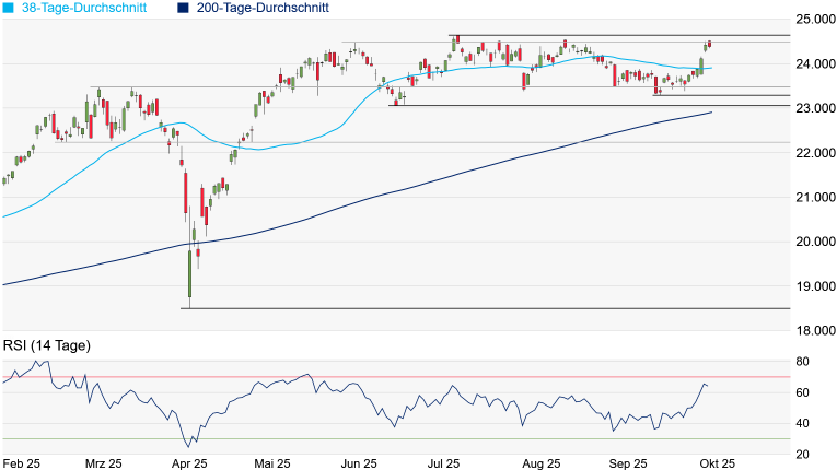 Dem DAX ist kurz vor dem Erreichen seines Rekordhochs vom Juli bei 24.639 Punkten die Puste ausgegangenen. Am Freitag ging es für den deutschen Leitindex bis auf 24.524 Punkte aufwärts, ehe etwas kräftigere Gewinnmitnahmen einsetzten. Das Chartbild hatte sich zuletzt noch nicht entscheidend weiter aufgehellt – am Donnerstag und Freitag scheiterte der DAX jeweils am Juni-Hoch bei 24.479 Punkten. Und dennoch erscheint die aktuelle Chart-Situation beim DAX vielversprechend. Durch die jüngsteTempoverschärfung scheint der DAX aus seiner Sommerkonsolidierung aufgewacht zu sein. Kann das Juni-Hoch nachhaltig gemeistert werden, wäre es nur noch ein Katzensprung bis zum Rekordhoch. Danach wäre auf der Oberseite erst einmal viel Platz. Eintrüben würde sich das kurzfristige Chartbild erst wieder, bei einem Unterschreiten der aktuell bei 23.906 Punkten verlaufenden 38-Tage-Linie.