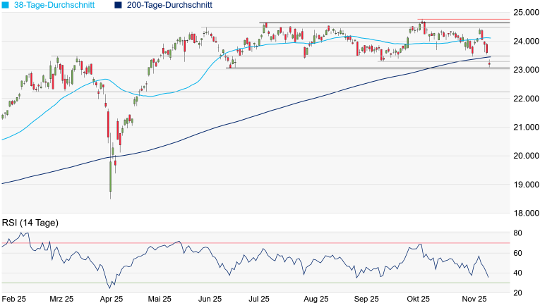 Der Goldpreis startete zuletzt einen Erholungsversuch, dem jedoch bei 4.243 US-Dollar die Puste ausging. Danach ging es wieder kräftig abwärts – gestern im Tief sogar bis auf 4.009 Dollar. Die aktuell bei etwa 4.035 Dollar verlaufende 38-Tage-Linie konnte der Goldpreis letztlich jedoch behaupten. Doch heute in den frühen Morgenstunden kämpft der Goldpreis erneut mit dem vielbeachteten Durchschnitt. Geht es nachhaltig darunter, könnte es noch einmal in Richtung des jüngsten Korrekturtiefsvom 28. Oktober bei 3.887 Dollar gehen. Geht es darunter, droht sogar akute Gefahr, denn die nächste signifikante Unterstützung würde dann erst im Bereich 3.650 Dollar auftauchen. Kann die 38-Tage-Linie hingegen verteidigt werden, könnte das jüngste Erholungshoch noch einmal angesteuert werden. Geht es sogar darüber, dürfte einem Angriff auf das Rekordhoch bei 4.380 Dollar kaum etwas im Wege stehen.