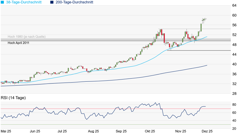 Charttechnik: Nach einer kurzen Verschnaufpause gegen Ende Oktober hat der Silberpreis zuletzt wieder Fahrt aufgenommen. Mitte November ging es bereits bis auf wenige US-Cent an das im Oktober erreichte Hoch bei 54,47 Dollar heran, ehe der Markt noch einmal Luft holte. Am vergangenen Freitag konnte das Hoch dann aber überquert werden. Der Ausbruch verlief recht dynamisch und beförderte den Silberpreis gestern bis knapp an die Marke von 59 Dollar heran. Das Plus seit Jahresanfang ist damit auf über 104Prozent geklettert. Wohin die Reise noch gehen kann, ist ungewiss. Die runde 60-Dollar-Marke könnte kurzfristig ein mögliches Anlaufziel sein. Angesichts der angespannten Situation am Silbermarkt könnten aber auch noch weitaus höhere Regionen erreicht werden. Allerdings kann es auch jederzeit zu Gewinnmitnahmen kommen. Bereits im Oktober ging es mehr als 16 Prozent innerhalb weniger Tage abwärts. Die Hochpunkte aus den Jahren 1980 bei knapp über 50 Dollar (je nach Quelle) und 2011 bei49,51 Dollar sollten jedoch für eine gute Unterstützung sorgen.