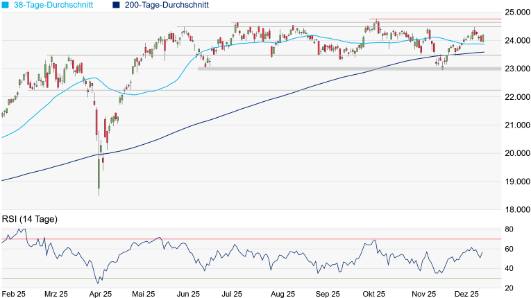 Charttechnik: Der DAX hat seine Richtung gestern wieder geändert und einen kräftigen Satz nach oben gemacht. Die tags zuvor unterschrittene 24.000-Punkte-Marke konnte zurückerobert werden, womit sich die Gesamtsituation wieder leicht aufgehellt hat. Die runde Marke spielt aus charttechnischer Sicht zwar eine eher untergeordnete Rolle, doch sollte ihr psychologischer Charakter nicht unterschätzt werden, sagte ein Marktbeobachter. Ob es nun doch noch zu einem Jahresendspurt kommt, muss abgewartet werden.Charttechnisches Kaufinteresse dürfte aber wohl erst bei einem Überqueren des Juni-Hochs bei 24.479 Punkten aufkommen. Danach würde sich bis zum Rekordhoch vom Oktober bei 24.771 Punkten nur noch das Juli-Hoch bei 24.639 Punkten in den Weg stellen. Der aktuell bei 23.863 Punkten verlaufende 38-Tage-Durchschnitt ist aber weiterhin in Reichweite. Ein Unterschreiten könnte zusätzlichen Abwärtsdruck erzeugen. Die nächste Unterstützung würde dann am aktuell bei 23.586 Punkten verlaufenden200-Tage-Durchschnitt auftauchen. Wird auch dieser unterschritten, dürfte der Verkaufsdruck zunehmen. Nachhaltig kippen könnte die Stimmung, wenn auch das vielbeachtete Doppeltop vom März bei 23.476 Punkten unterschritten wird.