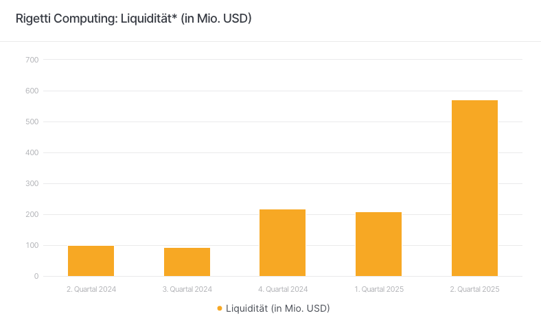 «Wir profitieren von den vielen Vorteilen supraleitender Qubits, darunter Gate-Geschwindigkeiten, die mehr als 1`000-mal schneller sind als bei anderen Modalitäten», schwärmt CEO Subodh Kulkarni. Ende September erhielt Rigetti einen Auftrag für zwei «Novera»-Systeme mit einer Leistung von 9 Qubit. Neben einem japanischen Technologiefertiger steckt ein kalifornisches Start-up für angewandte Physik und KI hinter den zusammen rund USD 5.7 Mio. schweren Orders. Beide Systeme sollen im ersten Semester 2026 ausgeliefert werden. Wie die Geschäfte im dritten Quartal 2025 gelaufen sind, erfahren Anleger am 10. November. Mit dem Zwischenbericht dürfte der CEO ein Update zur technologischen Entwicklungsarbeit geben. Am Geld sollte der Innovationsdrang der knapp 150 Mitarbeiter nicht scheitern. Dank einer im Juni durchgeführten Kapitalerhöhung verfügte Rigetti per Mitte Jahr über eine Liquidität von knapp USD 571 Mio. (siehe Grafik)