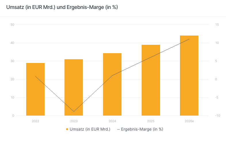 Nomen ist bei Siemens Energy Omen: Der Konzern bespielt die gesamte Bandbreite der Energieversorgung. Neben einer Sparte für Gasturbinen zählen dazu Lösungen für die Stromübertragung sowie die Windkraftsparte Siemens Gamesa. Der letztgenannte Geschäftszweig entpuppte sich nach dem Börsenlisting von Siemens Energy als Hemmschuh. Doch nach Jahren in den tiefroten Zahlen möchte das Management in der laufenden Geschäftsperiode 2026 (per 30.09.) bei Siemens Gamesa den Break-even erreichen. Konzernweit steigt die Profitabilität schon jetzt kräftig. Für die laufende Periode peilt das Management um CEO Christian Bruch eine Ergebnismarge vor Sondereffekten zwischen 9 % und 11 % an. Schafft der Konzern das obere Ende der Spanne, würde die Kennzahl gegenüber dem Vorjahr um satte 500 Basispunkte steigen.